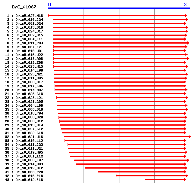 Reference: Altschul, Stephen F., Thomas L. Madden, Alejandro A. Schäffer, Jinghui Zhang, Zheng Zhang, Webb Miller, and David J. Lipman (1997), "Gapped BLAST and PSI-BLAST: a new generation of protein database search programs", Nucleic Acids Res. 25:3389-3402. Query= DrC_01087 (390 letters) Database: Non-redundant SwissProt sequences 184,735 sequences; 68,354,980 total letters Score E Sequences producing significant alignments: (bits) Value sp|Q8D2H4|LPXB_WIGBR Lipid-A-disaccharide synthase 32 0.34 sp|Q86WR7|CJ047_HUMAN Protein C10orf47 31 0.99 sp|O80948|MB23_ARATH Myrosinase binding protein-like At2g39330 28 4.9 sp|P00723|BGAL_KLULA Beta-galactosidase (Lactase) 28 6.4 sp|Q9UW81|NOP1_NEUCR Opsin-1 (NR) 28 6.4 sp|P30543|AA2AR_RAT Adenosine A2a receptor 28 8.4